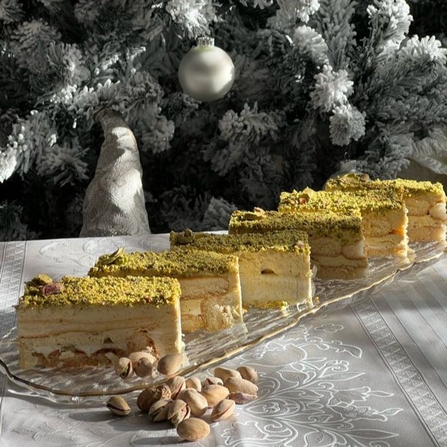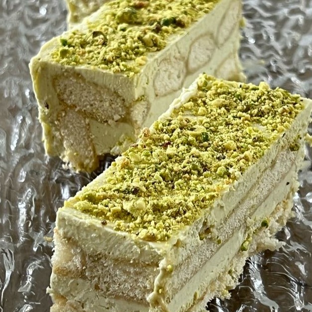 Our Pistachio Tiramisu is a decadent twist on the beloved Italian classic — handcrafted with layers of delicate ladyfingers, rich pistachio cream, and smooth mascarpone filling. Each piece combines the soft texture of soaked sponge with the nutty aroma of premium pistachio paste, creating a balanced, melt-in-your-mouth dessert.